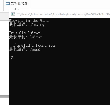 #include <stdio.h> #define N 1000 int main() { char line[N]; int word_len; // 记录当前单词长度 int max_len; // 记录最长单词长度 int end; // 记录最长单词结束位置 int i; while(gets(line) != NULL) { word_len = 0; max_len = 0; end = 0; i = 0; while(1) { // 跳过连续空格 while(line[i] == ' ') { word_len = 0; // 单词长度置0,为新单词统计做准备 i++; } // 在一个单词中,统计当前单词长度 while(line[i] != '\0' && line[i] != ' ') { word_len++; i++; } // 更新更长单词长度,并,记录最长单词结束位置 if(max_len < word_len) { max_len = word_len; end = i; // end保存的是单词结束的下一个坐标位置 } // 遍历到文本结束时,终止循环 if(line[i] == '\0') break; } // 输出最长单词 printf("最长单词: "); for(i = end - max_len; i < end; ++i) printf("%c", line[i]); printf("\n\n"); } return 0; }
