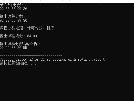 #include <stdio.h> #define N 5 // 函数声明 void input(int x[], int n); void output(int x[], int n); double average(int x[], int n); void bubble_sort(int x[], int n); int main() { int scores[N]; double ave; printf("录入%d个分数:\n", N); input(scores, N); printf("\n输出课程分数: \n"); output(scores, N); printf("\n课程分数处理: 计算均分、排序...\n"); ave = average(scores, N); bubble_sort(scores, N); printf("\n输出课程均分: %.2f\n", ave); printf("\n输出课程分数(高->低):\n"); output(scores, N); return 0; } // 函数定义 // 输入n个整数保存到整型数组x中 void input(int x[], int n) { int i; for(i = 0; i < n; ++i) scanf("%d", &x[i]); } // 输出整型数组x中n个元素 void output(int x[], int n) { int i; for(i = 0; i < n; ++i) printf("%d ", x[i]); printf("\n"); } double average(int x[], int n){ double ave, sum=0; int i; for(i=0;i < n;i++){ sum+=x[i]; } ave=sum/i; return ave; } // 计算整型数组x中n个元素均值,并返回 // 补足函数average()实现 // ××× void bubble_sort(int x[], int n){ int i,j; int temp; for(i=0;i<n-1;i++) { for(j=0;j<n-i-1;j++){ if(x[j]<x[j+1]){ temp = x[j]; x[j] = x[j+1]; x[j+1] = temp; } } } return 0; }