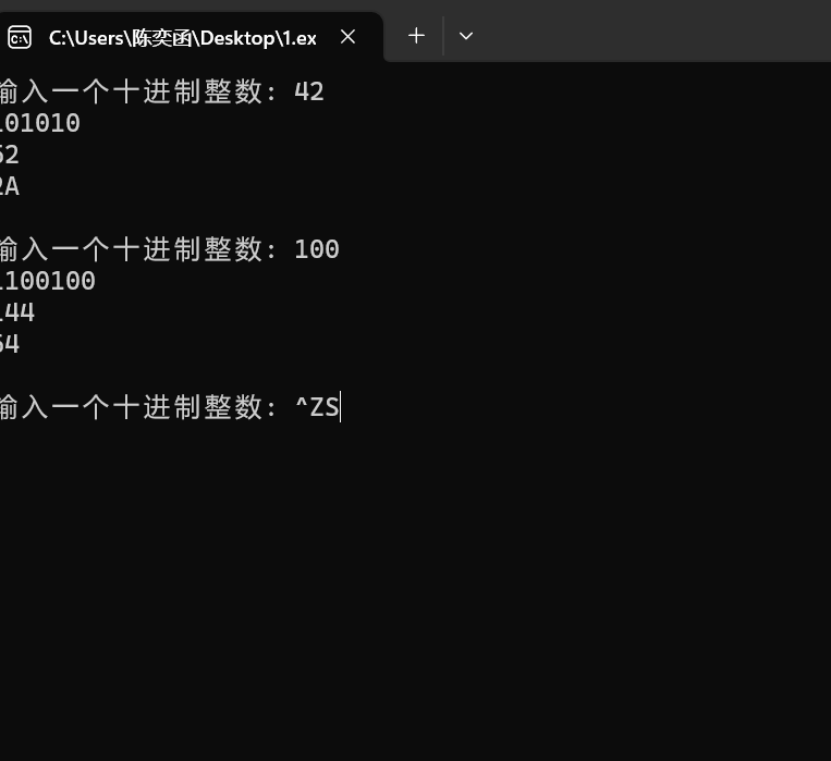 #include <stdio.h> #define N 100 void dec2n(int x, int n); // 函数声明 int main() { int x; printf("输入一个十进制整数: "); while(scanf("%d", &x) != EOF) { dec2n(x, 2); // 函数调用: 把x转换成二进制输出 dec2n(x, 8); // 函数调用: 把x转换成八进制输出 dec2n(x, 16); // 函数调用: 把x转换成十六进制输出 printf("\n输入一个十进制整数: "); } return 0; } // 函数定义 // 功能: 把十进制数x转换成n进制,打印输出 // 补足函数实现 void dec2n(int x, int n) { char ref[16]={'0','1','2','3','4','5','6','7','8','9','A','B','C','D','E','F'}; int ans[N]; int i=0; while(x!=0) { ans[i]=x%n; ans[i+1]='\0'; x=x/n; i++; } for( ;i!=0;i--) { printf("%c", ref[ans[i-1]]); } printf("\n"); }