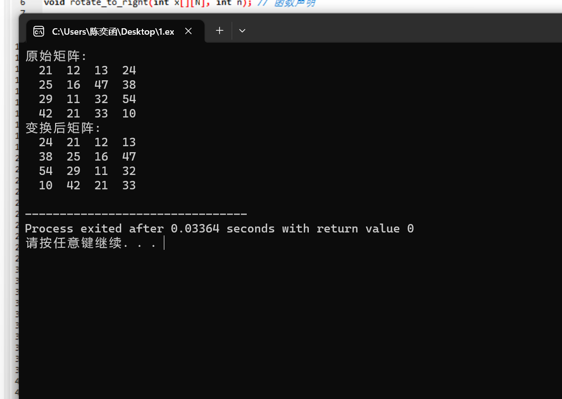 #include <stdio.h> #define N 100 #define M 4 void output(int x[][N], int n); // 函数声明 void rotate_to_right(int x[][N], int n); // 函数声明 int main() { int t[][N] = {{21, 12, 13, 24}, {25, 16, 47, 38}, {29, 11, 32, 54}, {42, 21, 33, 10}}; printf("原始矩阵:\n"); output(t, M); // 函数调用 rotate_to_right(t, M); // 函数调用 printf("变换后矩阵:\n"); output(t, M); // 函数调用 return 0; } // 函数定义 // 功能: 输出一个n*n的矩阵x void output(int x[][N], int n) { int i, j; for (i = 0; i < n; ++i) { for (j = 0; j < n; ++j) printf("%4d", x[i][j]); printf("\n"); } } // 待补足3:函数rotate_to_right()定义 // 功能: 把一个n*n的矩阵x,每一列向右移, 最右边被移出去的一列绕回左边 void rotate_to_right(int x[][N], int n) { int i,j,tmp; for(i=0;i<n;i++) { tmp=x[i][M-1]; for(j=M-1;j>=1;j--) { x[i][j]=x[i][j-1]; } x[i][0]=tmp; } }
