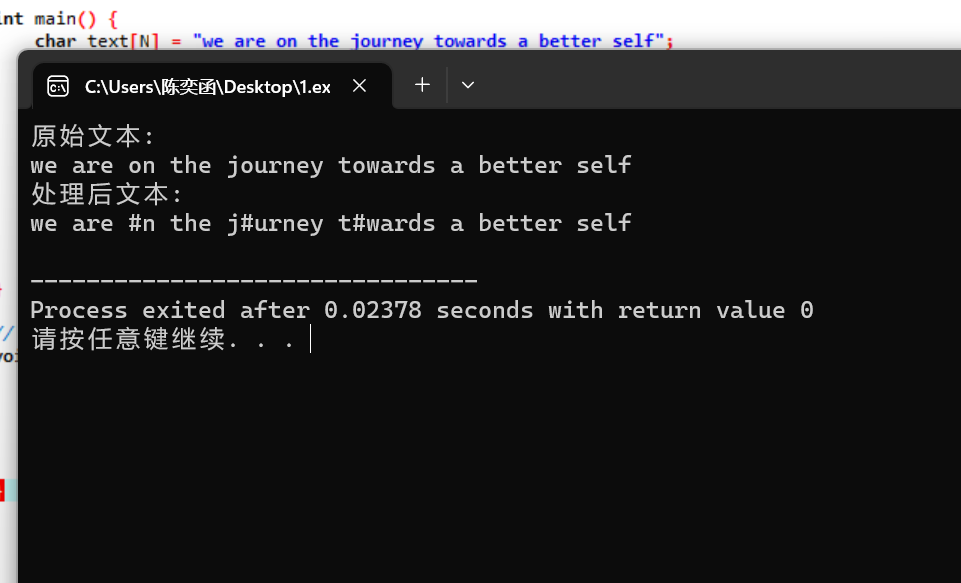 #include <stdio.h> #define N 80 void replace(char x[], char old_char, char new_char); // 函数声明 int main() { char text[N] = "we are on the journey towards a better self"; printf("原始文本: \n"); printf("%s\n", text); replace(text, 'o', '#'); // 函数调用 注意字符形参写法,单引号不能少 printf("处理后文本: \n"); printf("%s\n", text); return 0; } // 函数定义 void replace(char x[], char old_char, char new_char) { int i; for (i = 0; x[i] != '\0'; ++i) // 思考: '\0'是什么,为什么能作为循环结束条件 if (x[i] == old_char) x[i] = new_char; }