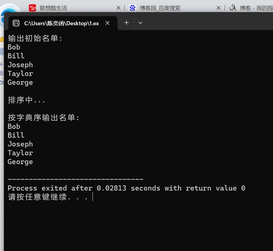 #include <stdio.h> #include <string.h> #define N 5 #define M 20 void bubble_sort(char str[][M], int n); // 函数声明 int main() { char name[][M] = {"Bob", "Bill", "Joseph", "Taylor", "George"}; int i; printf("输出初始名单:\n"); for (i = 0; i < N; i++) printf("%s\n", name[i]); printf("\n排序中...\n"); bubble_sort(name, N); // 函数调用 printf("\n按字典序输出名单:\n"); for (i = 0; i < N; i++) printf("%s\n", name[i]); return 0; } // 函数定义 // 功能:使用冒泡排序算法对二维数组str中的n个字符串按字典序排序 // 补足函数bubble_sort()实现 void bubble_sort(char str[][M], int n) { char tmp[M]; int i,j=0; for(i=0;i<n-1;i++) { for(j=0;j<j-i-1;j++) { if(strcmp(str[j],str[j+1])>0) { strcpy(tmp, str[j]); strcpy(str[j], str[j + 1]); strcpy(str[j + 1], tmp); } } } }