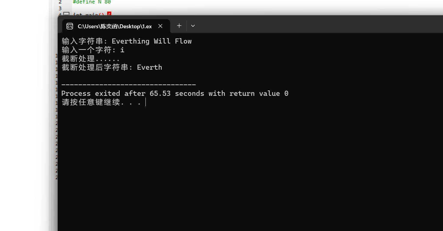 #include <stdio.h> #define N 80 int main() { char str[N], ch; int i; printf("输入字符串: "); gets(str); printf("输入一个字符: "); ch = getchar(); printf("截断处理......"); i = 0; while (str[i] != '\0') { if (str[i] == ch) break; // blank1 i++; // blank2 } str[i] = '\0'; // blank3 printf("\n截断处理后字符串: %s\n", str); return 0; }