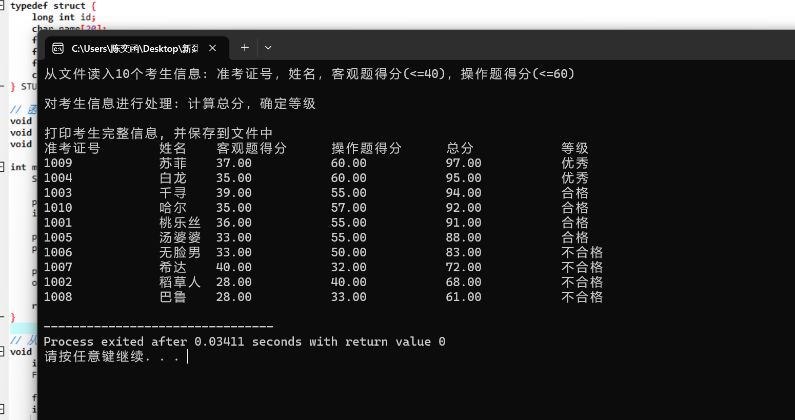 #include <stdio.h> #include <string.h> #include <stdlib.h> #define N 10 typedef struct { long int id; char name[20]; float objective; // 客观题得分 float subjective; // 操作题得分 float sum; char level[10]; } STU; // 函数声明 void input(STU s[], int n); void output(STU s[], int n); void process(STU s[], int n); int main() { STU stu[N]; printf("从文件读入%d个考生信息: 准考证号,姓名,客观题得分(<=40),操作题得分(<=60)\n", N); input(stu, N); printf("\n对考生信息进行处理: 计算总分,确定等级\n"); process(stu, N); printf("\n打印考生完整信息, 并保存到文件中"); output(stu, N); return 0; } // 从文本文件examinee.txt读入考生信息:准考证号,姓名,客观题得分,操作题得分 void input(STU s[], int n) { int i; FILE* fin; fin = fopen("D:/Seven/examinee.txt", "r"); if (fin == NULL) { printf("fail to open file\n"); exit(0); } while (!feof(fin)) { for (i = 0; i < n; i++) fscanf(fin, "%ld %s %f %f", &s[i].id, s[i].name, &s[i].objective, &s[i].subjective); } fclose(fin); } // 输出考生完整信息: 准考证号,姓名,客观题得分,操作题得分,总分,等级 // 不仅输出到屏幕上,还写到文本文件result.txt中 void output(STU s[], int n) { FILE* fout; int i; // 输出到屏幕 printf("\n"); printf("准考证号\t姓名\t客观题得分\t操作题得分\t总分\t\t等级\n"); for (i = 0; i < n; i++) printf("%ld\t\t%s\t%.2f\t\t%.2f\t\t%.2f\t\t%s\n", s[i].id, s[i].name, s[i].objective, s[i].subjective, s[i].sum, s[i].level); // 保存到文件 fout = fopen("result.txt", "w"); if (!fout) { printf("fail to open or create result.txt\n"); exit(0); } fprintf(fout, "准考证号\t\t姓名\t客观题得分\t操作题得分\t总分\t\t等级\n"); for (i = 0; i < n; i++) fprintf(fout, "%ld\t\t%s\t%.2f\t\t%.2f\t\t%.2f\t\t%s\n", s[i].id, s[i].name, s[i].objective, s[i].subjective, s[i].sum, s[i].level); fclose(fout); } // 对考生信息进行处理:计算总分,排序,确定等级 void process(STU s[], int n) { STU tmp; int i, j; for (i = 0; i < n; ++i) { s[i].sum =s[i].objective+s[i].subjective; } for (i = 0; i < n-1; ++i) { for (j = 0; j < n- i-1; ++j) { if (s[j].sum < s[j + 1].sum) { tmp = s[j]; s[j] = s[j + 1]; s[j + 1] = tmp; } } } for (i = 0; i < n; ++i) { if (i <= n * 0.1) strcpy(s[i].level, "优秀"); else if (i > n * 0.1 && i <= n * 0.5) strcpy(s[i].level, "合格"); else strcpy(s[i].level, "不合格"); } }