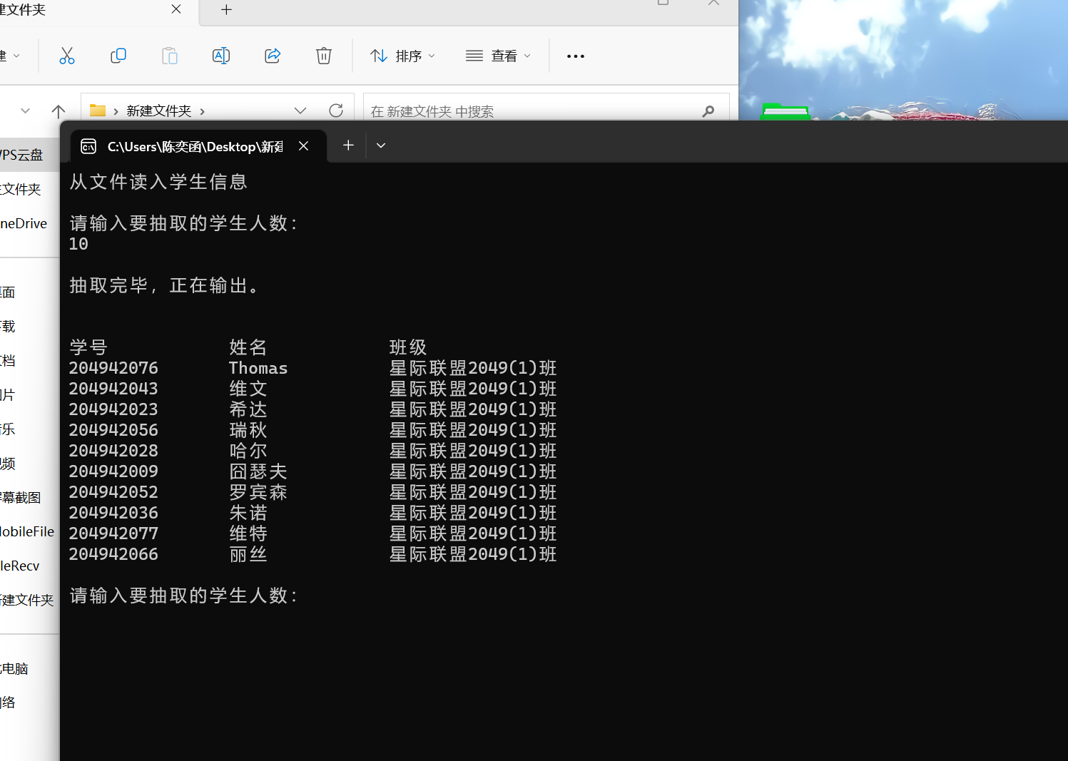 //task6 #include <stdio.h> #include <string.h> #include <stdlib.h> #include <time.h> #define N 80 typedef struct { int id; char name[20]; char classes[30]; } STU; void input(STU s[], int n); void output(STU s[], int n); void process(STU s[], STU t[], int n); int main() { STU stu[N], lucky[N]; int num; printf("从文件读入学生信息\n\n"); input(stu, N); srand(time(NULL)); while(1) { printf("请输入要抽取的学生人数:\n"); scanf("%d", &num); if(num == 0) break; process(stu, lucky, num); printf("\n抽取完毕,正在输出。\n\n"); output(lucky, num); } return 0; } void input(STU s[], int n) { int i; FILE *fin; fin = fopen("list.txt", "r"); if (fin == NULL) { printf("fail to open file\n"); exit(0); } while (!feof(fin)) { for (i = 0; i < n; i++) fscanf(fin, "%d %s %s", &s[i].id, s[i].name, s[i].classes); } fclose(fin); } void output(STU s[], int n) { FILE *fout; int i; time_t timeseed; struct tm *now; char name[N] = {0}; time(×eed); now = localtime(×eed); strftime(name, N, "%Y.%m.%d %H-%M-%S.txt", now); printf("\n"); //printf("%s\n", name); printf("学号\t\t姓名\t\t班级\n"); for (i = 0; i < n; i++) printf("%d\t%s\t\t%s\n", s[i].id, s[i].name, s[i].classes); printf("\n"); fout = fopen(name, "w"); if (!fout) { printf("fail to open or create lucky.txt\n"); exit(0); } fprintf(fout, "学号\t\t姓名\t\t班级\n"); for (i = 0; i < n; i++) fprintf(fout, "%d\t%s\t\t%s\n", s[i].id, s[i].name, s[i].classes); fclose(fout); } void process(STU s[], STU t[], int n) { int i, k; STU *temp[N]; for(i = 0; i < N; i++) temp[i] = &s[i]; for( i = 0; i < n; ) { k = rand()%N; if(temp[k] != NULL) { t[i++] = s[k]; temp[k] = NULL; } } }