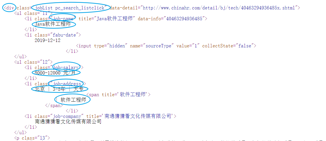 分析页面的HTML代码可以得出,我们想要的数据在属性为class="jobList pc_search_listclick"的div标签中。其中岗位名称在属性为class="job-name"的li标签中;薪资水平在属性为job-salary的li标签中;公司名称在属性为job-company的li标签中;其他信息在属性为job-address的li标签中。