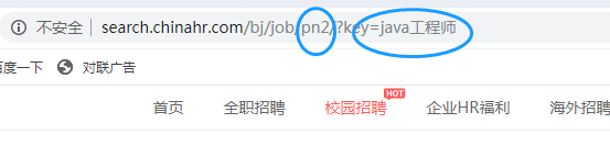 从图中我们可以看到,我们输入的岗位在key后面,页码在pn后面。接下来我们只要对这两处进行修改即可得到我们想要的页面。