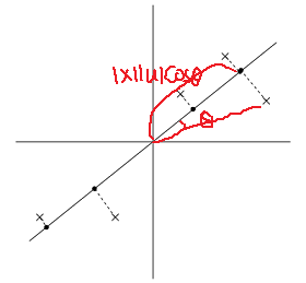 下图中,星号代表数据,原点代表数据在单位向量u上的投影(|x||u|cosΘ)