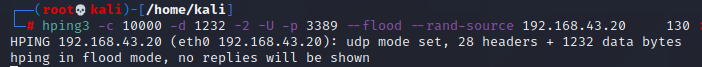 构造了数量为10000的数据包,数据包大小为1232,攻击方式为UDP,攻击端口为3389,攻击模式为洪水,