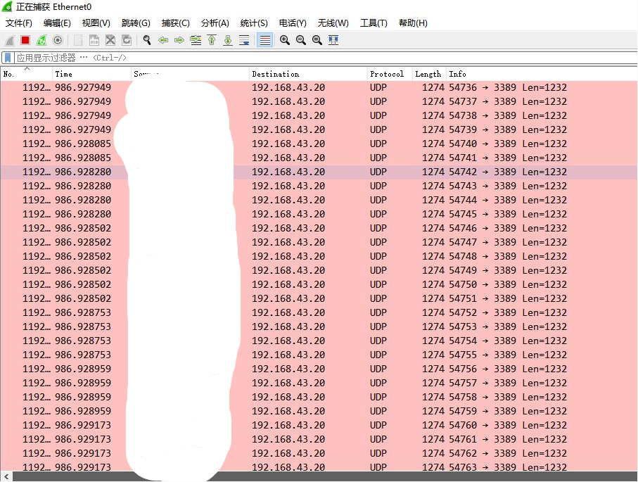 查看wireshark发现大量UDP报文。源IP地址为不同的IP,攻击端口为3389,数据包大小为1232。