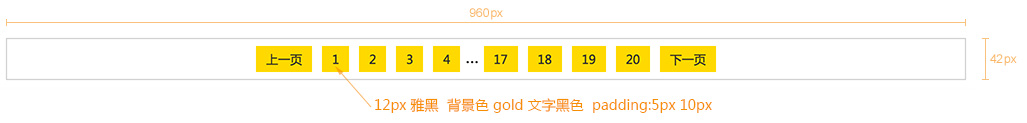 1 <!DOCTYPE html> 2 <html lang="en"> 3 <head> 4 <meta charset="UTF-8"> 5 <title>上下翻页案例</title> 6 </head> 7 <style> 8 9 .kuang{ 10 11 width: 958px; 12 height: 40px; 13 border: 1px solid #f0f0f0; 14 margin: 50px auto; 15 text-align: center; 16 line-height: 40px; 17 font-family: "微软雅黑"; 18 } 19 20 .kuang a{ 21 22 padding: 5px 10px; 23 background-color: gold; 24 text-decoration: none; 25 font-size: 12px; 26 } 27 28 .kuang a:hover{ 29 background-color: red; 30 color: #fff; 31 } 32 33 </style> 34 <body> 35 <div class="kuang"> 36 <a href="">上一页</a> 37 <a href="">1</a> 38 <a href="">2</a> 39 <a href="">3</a> 40 <a href="">4</a> 41 <span>...</span> 42 <a href="">17</a> 43 <a href="">18</a> 44 <a href="">19</a> 45 <a href="">20</a> 46 <a href="">下一页</a> 47 48 </div> 49 </body> 50 </html>