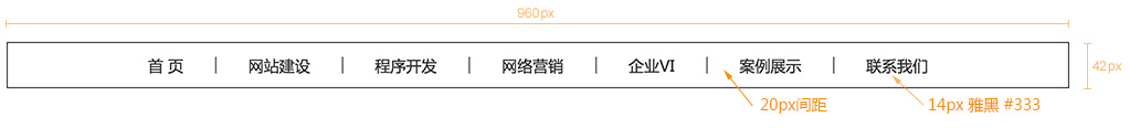 1 <!DOCTYPE html> 2 <html lang="en"> 3 <head> 4 <meta charset="UTF-8"> 5 <title>菜单</title> 6 <style> 7 8 ul{ 9 width: 958px; 10 height: 40px; 11 border: 1px solid #f0f0f0; 12 line-height: 40px; 13 text-align: center; 14 margin: 100px auto; 15 } 16 17 ul li{ 18 display: inline-block; 19 padding: 0 15px; 20 21 } 22 23 ul li a{ 24 display: inline-block; 25 26 27 28 text-decoration: none; 29 } 30 31 32 33 </style> 34 </head> 35 <body> 36 37 <ul> 38 <li><a href="">首页</a></li> 39 <li>|</li> 40 <li><a href="">网站建设</a></li> 41 <li>|</li> 42 <li><a href="">程序开发</a></li> 43 <li>|</li> 44 <li><a href="">网络营销</a></li> 45 <li>|</li> 46 <li><a href="">企业VI</a></li> 47 <li>|</li> 48 <li><a href="">案例展示</a></li> 49 <li>|</li> 50 <li><a href="">联系我们</a></li> 51 </ul> 52 </body> 53 </html>