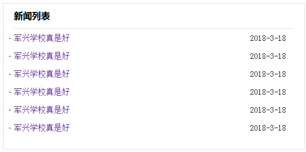 1 <!DOCTYPE html> 2 <html lang="en"> 3 <head> 4 <meta charset="UTF-8"> 5 <title>新闻列表</title> 6 <style> 7 8 div{ 9 width: 602px; 10 height: 292px; 11 border: 1px solid #ddd; 12 margin: 50px auto; 13 14 } 15 16 h2{ 17 font-size: 18px; 18 font-family: "微软雅黑"; 19 border-bottom: 1px solid #ddd; 20 width: 560px; 21 margin: 0 auto; 22 height: 50px; 23 line-height: 50px; 24 } 25 26 ul { 27 line-height: 36px; 28 margin: 0; 29 padding: 0; 30 } 31 32 ul li{ 33 display: block; 34 list-style: none; 35 width: 560px; 36 height: 36px; 37 padding:0 5px; 38 39 40 } 41 42 ul li a{ 43 float: left; 44 text-decoration: none; 45 } 46 47 ul li span{ 48 float: right; 49 50 } 51 52 ul li a:before{ 53 content: "·"; 54 } 55 56 </style> 57 </head> 58 <body> 59 <div> 60 <h2>新闻列表</h2> 61 <ul> 62 <li><a href="">军兴学校真是好</a><span>2018-3-18</span></li> 63 <li><a href="">军兴学校真是好</a><span>2018-3-18</span></li> 64 <li><a href="">军兴学校真是好</a><span>2018-3-18</span></li> 65 <li><a href="">军兴学校真是好</a><span>2018-3-18</span></li> 66 <li><a href="">军兴学校真是好</a><span>2018-3-18</span></li> 67 <li><a href="">军兴学校真是好</a><span>2018-3-18</span></li> 68 </ul> 69 70 </div> 71 </body> 72 </html>