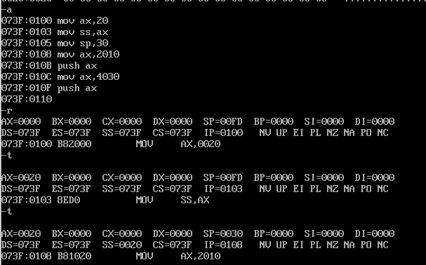 问题一:不是,由截图可知,在单步调试的过程中,执行完mov ss,ax指令后,直接跳到了mov ax,2010指令,即同时完成了mov sp,30指令。