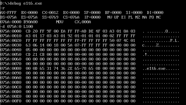 在debug中查看e1t6.exe的程序段前缀PSP的截图