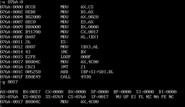 assume cs:code code segment mov ax,cs mov ds,ax mov ax,0020H mov es,ax mov bx,0 mov cx,0017H s:mov al,[bx] mov es:[bx],al inc bx loop s mov ax,4c00H int 21H code ends end