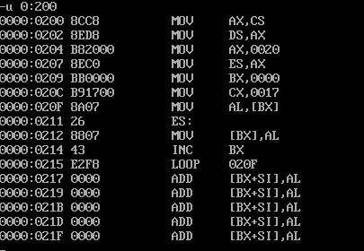 使用u命令反汇编0:200到复制代码长度这一段内存空间的截图: