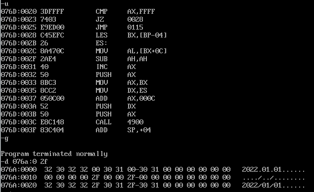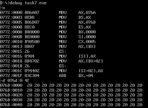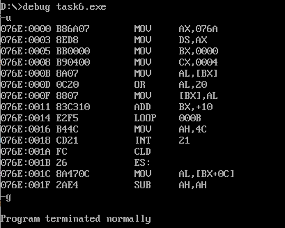 1 assume cs:code 2 data1 segment 3 db 50, 48, 50, 50, 0, 48, 49, 0, 48, 49 ; ten numbers 4 data1 ends 5 6 data2 segment 7 db 0, 0, 0, 0, 47, 0, 0, 47, 0, 0 ; ten numbers 8 data2 ends 9 10 data3 segment 11 db 16 dup(0) 12 data3 ends 13 14 code segment 15 start: 16 mov ax,data1 17 mov ds,ax 18 mov bx,0 19 mov cx,10 20 s: 21 mov al,[bx] 22 add al,[bx+16] 23 mov [bx+32],al 24 inc bx 25 loop s 26 27 mov ah,4ch 28 int 21h 29 code ends 30 end start