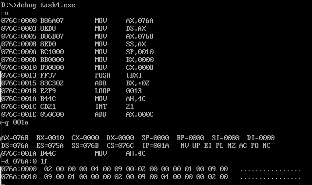 1 assume cs:code 2 3 data1 segment 4 dw 2, 0, 4, 9, 2, 0, 1, 9 5 data1 ends 6 7 data2 segment 8 dw 8 dup(?) 9 data2 ends 10 11 code segment 12 start: 13 mov ax,data1 14 mov ds,ax 15 mov ax,data2 16 mov ss,ax 17 mov sp,10h 18 mov bx,0 19 mov cx,8 20 s: 21 push [bx] 22 add bx,2 23 loop s 24 mov ah, 4ch 25 int 21h 26 code ends 27 end start
