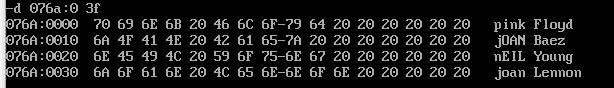 1 assume cs:code, ds:data 2 3 data segment 4 db 'Pink Floyd ' 5 db 'JOAN Baez ' 6 db 'NEIL Young ' 7 db 'Joan Lennon ' 8 data ends 9 10 code segment 11 start: 12 mov ax,data 13 mov ds,ax 14 mov bx,0 15 mov cx,4 16 s: 17 mov al,[bx] 18 or al,00100000b 19 mov [bx],al 20 add bx,16 21 loop s 22 mov ah, 4ch 23 int 21h 24 code ends 25 end start