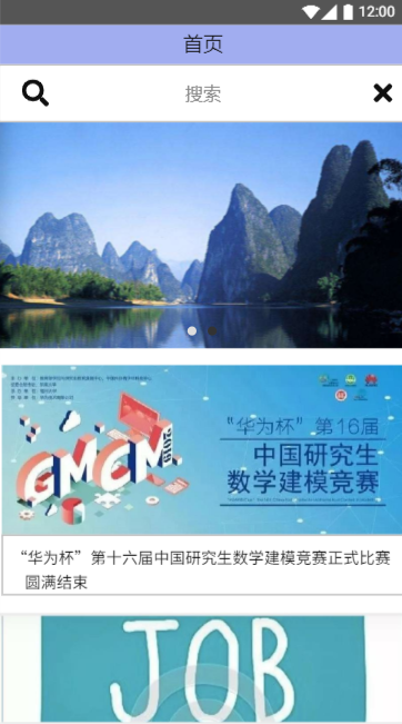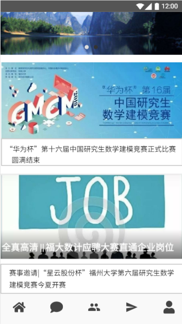 在登录成功之后,我们就进入了首页,首页会为用户推送一些科研竞赛、工作招聘等资讯以供用户查看,在首页下方有五个小图标,点击图标可以进入不同的界面: