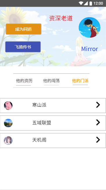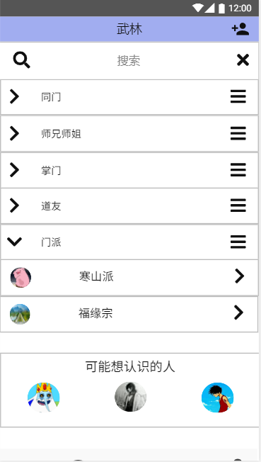 通讯录界面,将用户的好友、所加入的门派(家族树)进行分类,方便用户进行统一管理,并且我们会根据用户加入的门派来向用户推荐可能认识的其他用户: