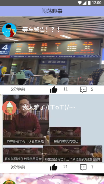 动态界面,每个用户可以可以将自己的动态发布到此页面上,同时页面会显示自己好友发布的一些动态,用户还可以对每条动态进行评论: