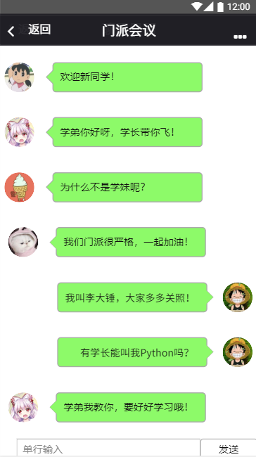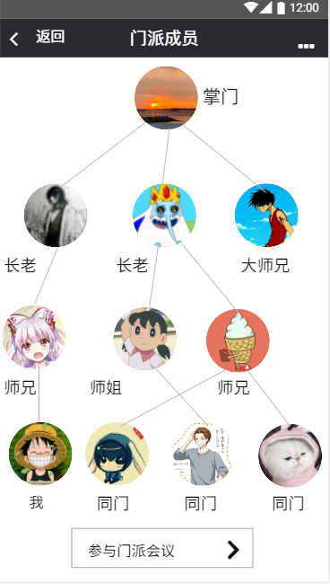 门派界面,门派界面显示的是用户加入的某一具体的门派,该界面采用树形的组织结构,能让用户清晰便捷地查看自己的学长学姐、老师等其他成员,并且点击“参加门派会议”还可以与门派成员一起讨论聊天:
