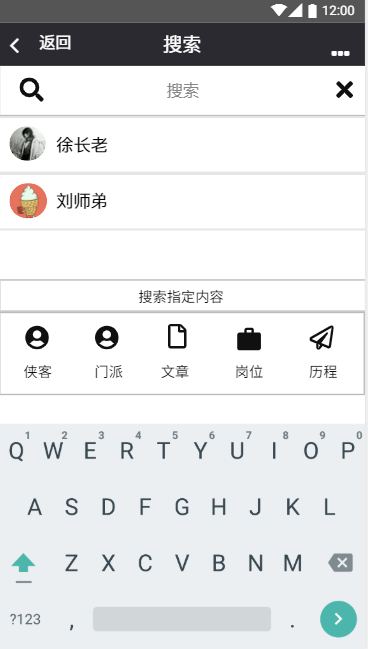 搜索界面,用户可以在搜索界面查找对应的人、帮派、文章、岗位信息等: