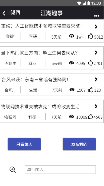 - 针对痛点3,我们的APP提供了热点文章查看的功能。我们提供了大量的当下热门文章看点,涵盖生活类,科研类,就业类等多个方面,用户可以对这些文章进行查看,评论,转发等各种操作,可以通过这些热点文章了解当下热门话题,或就业,或技术突破,或生活看点,供用户学习参考。