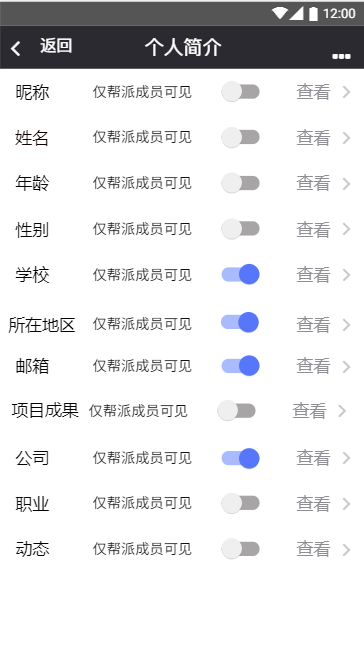 个人资料设置界面,用户可以对查看资料的权限进行设置,以保证用户的隐私安全: