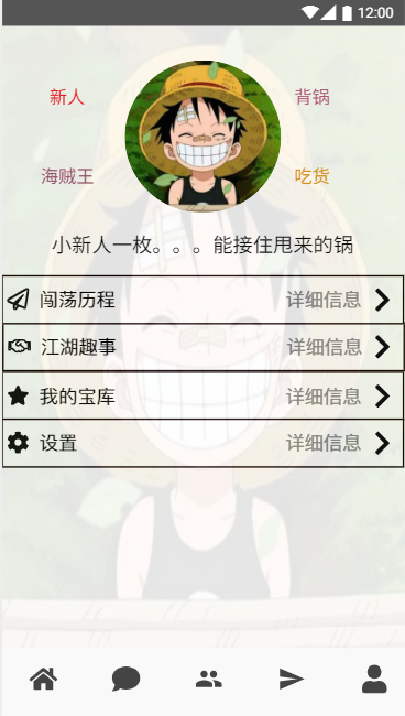 个人主页界面,用户可以在此界面上给自己添加一些标签,并且通过个人主页界面可以进入其他不同的界面,例如点击头像可以编辑修改个人资料;点击闯荡历程可以进入动态界面;点击江湖趣事可以进入热点推送界面;点击我的宝库可以进入收藏夹界面;点击设置可以对APP进行一些基础功能的设置: