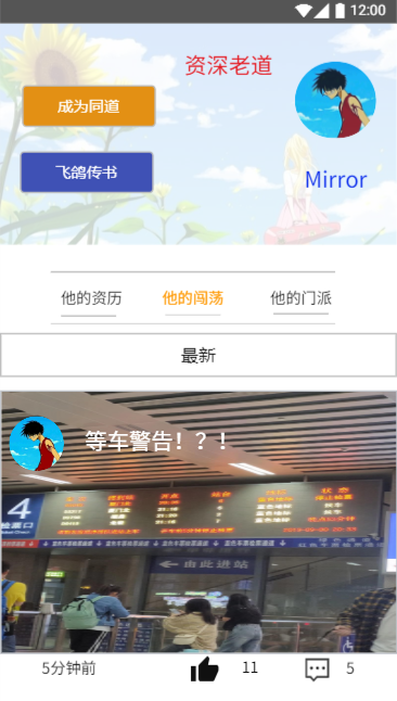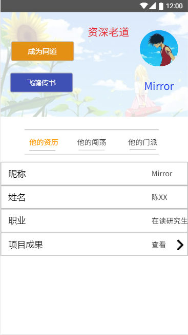 设计思路:在明确了我们要做的APP的具体功能之后,我们决定做一个比较有特色的APP。我们打算往我们的产品中加入一些类似于武林风格的元素,考虑到产品面向的用户主要是老师、刚入学的新生、已毕业工作的学生还有一些高年级的学生,所以我们打算为这四种用户分别配上一个身份标签,比如说老师就相当于掌门、学长学姐就相当于师兄师姐、与自己同一个老师的其他学生就相当于同门,我们还把师生家族树抽象成了武林中的帮派。虽然我们不明确融入这样的一个特色会不会能让用户有更好的体验,但也是我们的一次小创新和尝试吧!