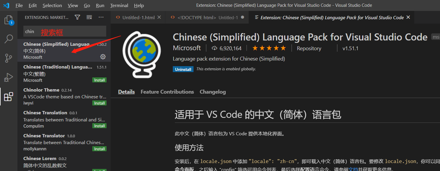 在搜索框里输入Chinese (Simplified) Language Pack for Visual Studio Code