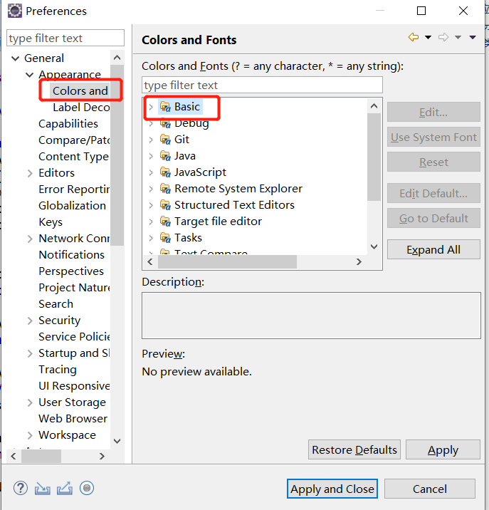 4.找到第一行Colors and Fonts单击,在右边区域里找到Baic,单击