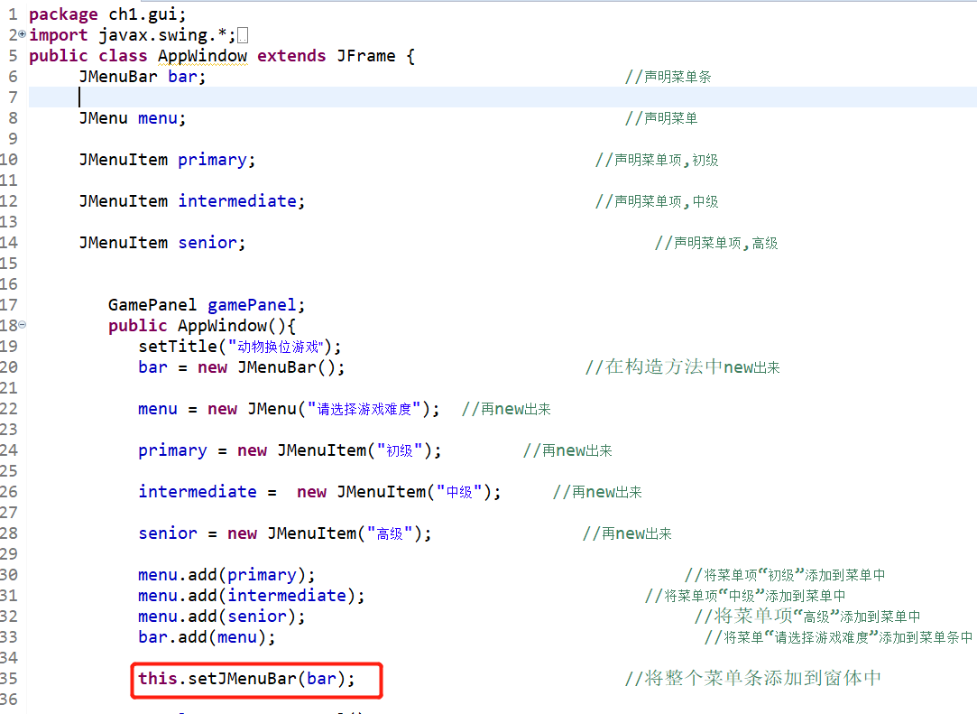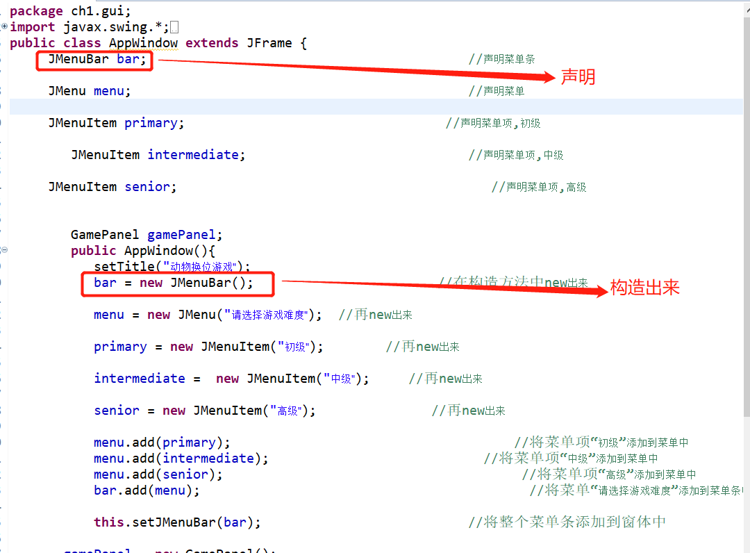 我们在窗体中创建菜单栏,首先需要创建菜单条,先声明,然后在构造方法中初始化;代码为:JMenuBar bar = new JMenuBar();
