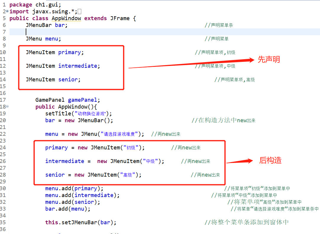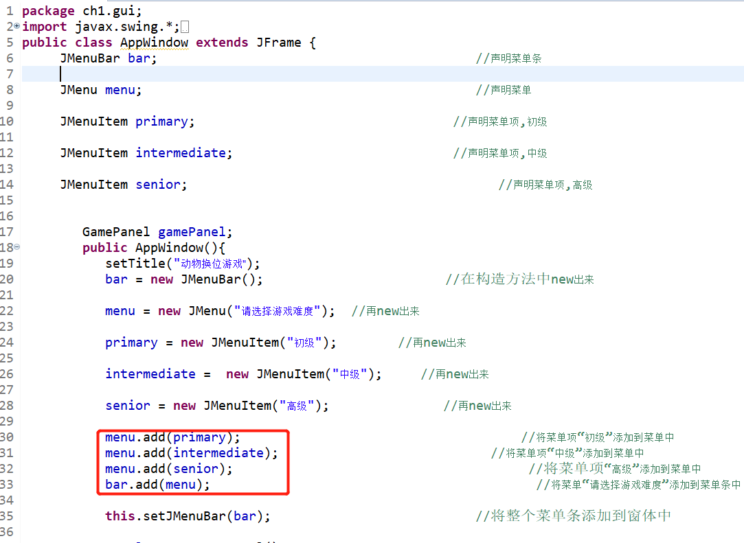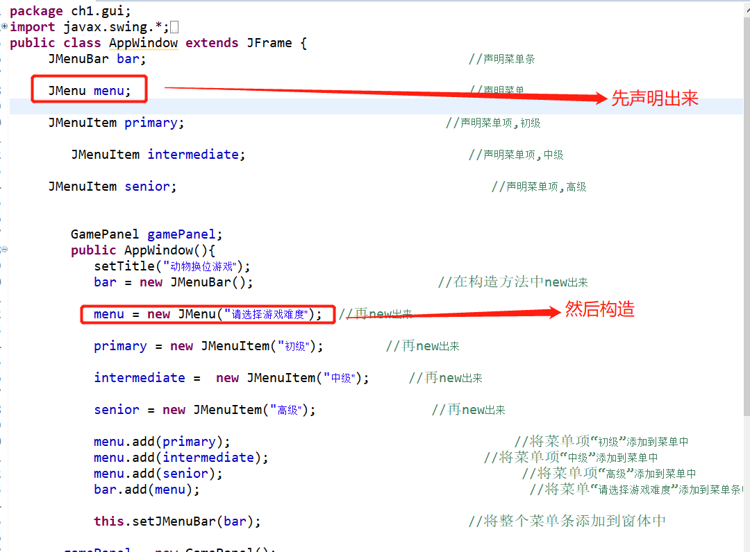 然后创建菜单,也和菜单条一样,也是先声明,再new;代码为:JMenu menu = new JMenu("请选择游戏难度");
