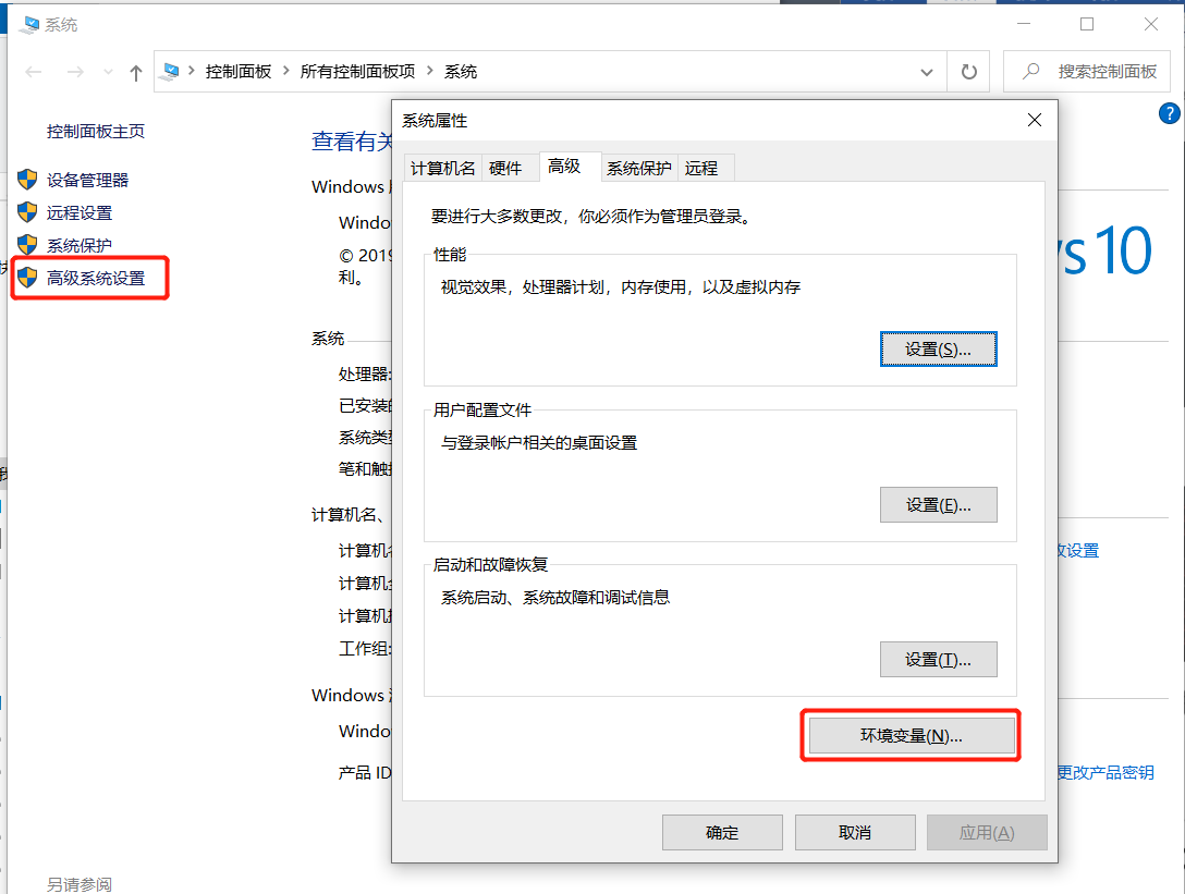 第一步在win10系统上,鼠标右键此电脑,选择属性,点击高级系统设置,然后点击环境变量,如下图:
