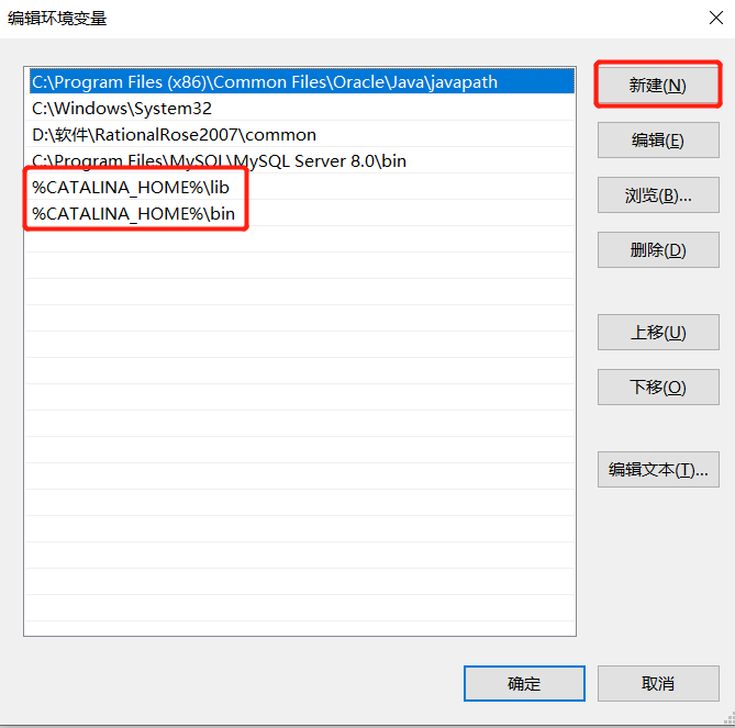 第四步,点击确定之后,找到path变量,双击进去分别添加“%CATALINA_HOME%\lib”和“%CATALINA_HOME%\bin”,如下图: