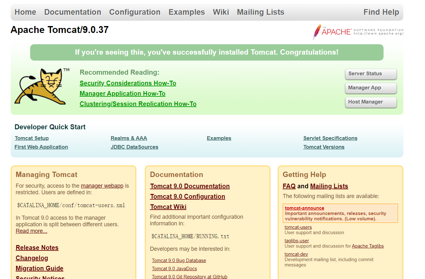 第六步不要擦掉启动的Tomcat,我们在浏览器地址栏输入"http://localhost:8080/",出现Tomcat界面表示环境配置成功,如下图: