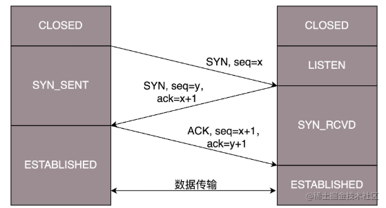 如果只是两次,无法证明A-B之间是互通的。四次、五次也可以,但是没有必要,因为网络环境是不确定的,n次握手也无法百分之百确定对方的状态。因此,三次握手是相对合理的,对于客户端来说,它发出的消息一去一回,对于服务器来说,它发出去的消息也是一去一回,这就可以说明两台机器之间网络是互通的,可以进行数据传输了。