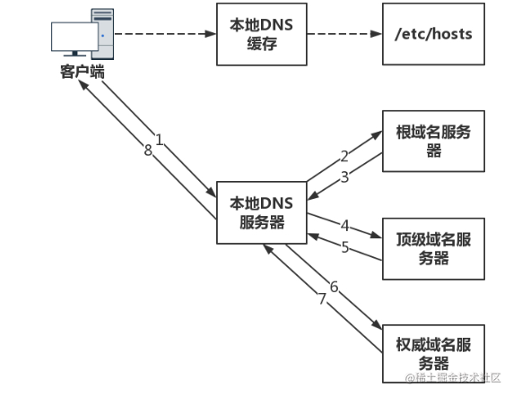 DNS解析域名的流程:(假设要访问的域名没有在本地DNS缓存中)本地DNS服务器会向根DNS服务器发起查询请求,根DNS服务器会返回顶级域DNS服务器的地址,然后本地DNS服务器向顶级域DNS服务器发起查询请求,顶级域DNS服务器返回权威DNS服务器的地址,最后本地DNS服务器再向权威DNS服务器发起请求,得到域名对应的IP地址。发起查询的主机会把查询结果缓存下来,下次访问这个域名的时候先查询本地缓存,若有则直接返回对应的IP地址。