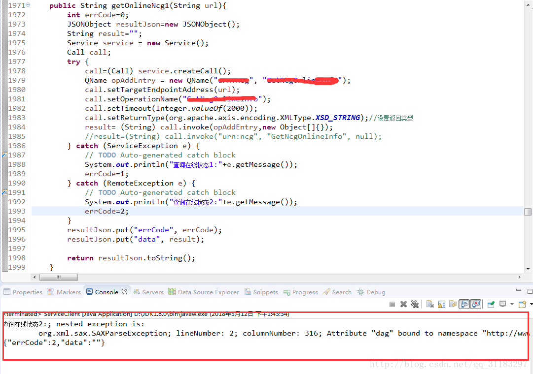 public String getOnline(String url){ int errCode=0; JSONObject resultJson=new JSONObject(); String result=""; Service service = new Service(); Call call; try { call=(Call) service.createCall(); QName opAddEntry = new QName("urn:demo", "GetOnlineInfo"); //设置命名空间和需要调用的方法名 call.setTargetEndpointAddress(url); //设置请求路径 call.setOperationName("GetNcgOnlineInfo"); //调用的方法名 call.setTimeout(Integer.valueOf(2000)); //设置请求超时 call.setReturnType(org.apache.axis.encoding.XMLType.XSD_STRING);//设置返回类型 result= (String) call.invoke(opAddEntry,new Object[]{}); } catch (ServiceException e) { // TODO Auto-generated catch block System.out.println("查询在线状态1:"+e.getMessage()); errCode=1; } catch (RemoteException e) { // TODO Auto-generated catch block System.out.println("查询在线状态2:"+e.getMessage()); errCode=2; } resultJson.put("errCode", errCode); resultJson.put("data", result); return resultJson.toString(); }
