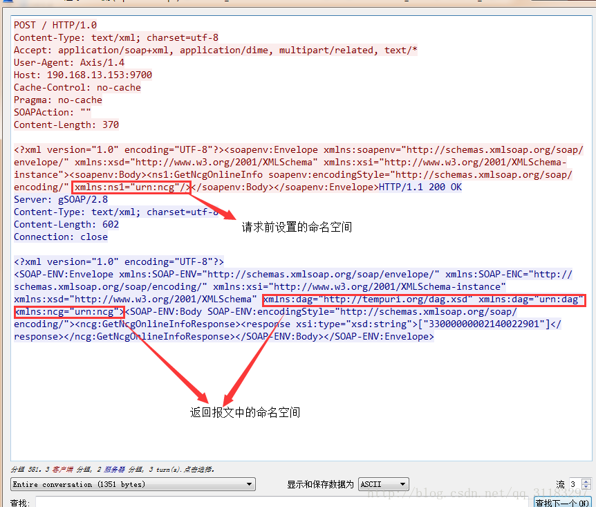 然后我利用Wireshark抓包,得到一下结果。可以看看出,我请求的是命名空间是 ns1="urn:ncg"(其余的都是wsdl默认自带的)。可是我收到的返回报文就变了。变成了这样的 xmlns:dag="http://tempuri.org/dag.xsd" xmlns:dag="urn:dag" xmlns:ncg="urn:ncg" 足足有三个啊。RPC按照默认设置的 ns1="urn:ncg" 去解析,那肯定什么都解析不了的。所以只有自己去解析了。这种情况可以利用第三种或者第四种方式进行调用。