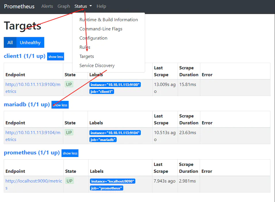回到web管理界面 -->点Status -->点Targets -->可以看到监控mariadb了