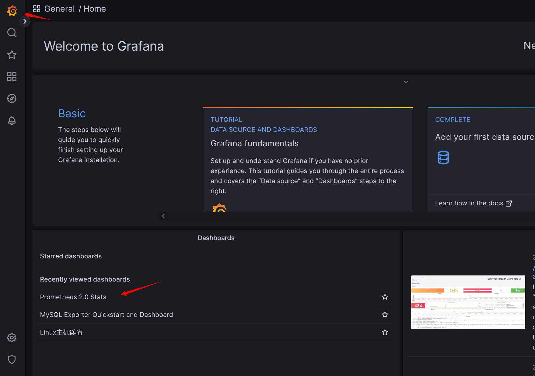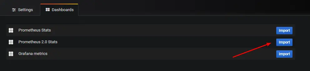 在添加数据源的位置上,右边的选项有个Dashboards的菜单选项,我们点击进去,然后导入prometheus2.0.
