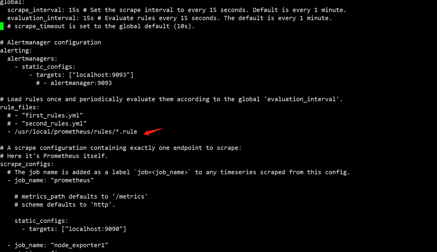 vi prometheus.yml配置文件,添加如下内容,alertmanage默认端口是9093