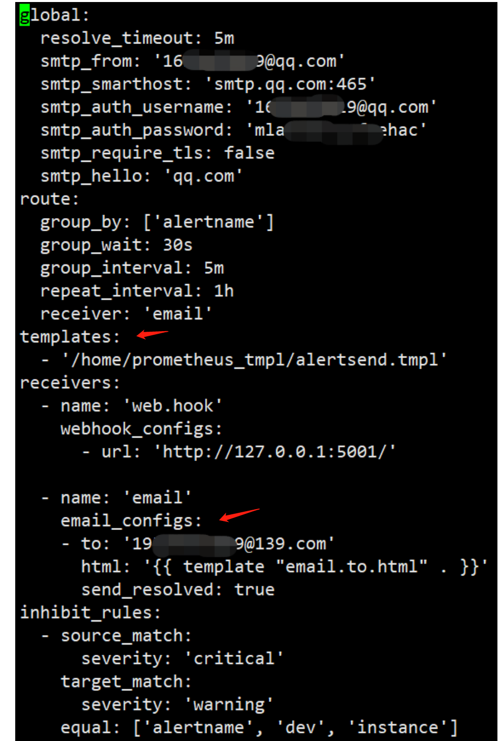 global: resolve_timeout: 5m smtp_from: '163xxxxxx@qq.com' smtp_smarthost: 'smtp.qq.com:465' smtp_auth_username: '163xxxxx@qq.com' smtp_auth_password: 'mlaatxxxxxxhac' smtp_require_tls: false smtp_hello: 'qq.com' route: group_by: ['alertname'] group_wait: 30s group_interval: 5m repeat_interval: 1h receiver: 'email' templates: - '/home/prometheus_tmpl/alertsend.tmpl' receivers: - name: 'web.hook' webhook_configs: - url: 'http://127.0.0.1:5001/' - name: 'email' email_configs: - to: '195xxxxxx@139.com' html: '{{ template "email.to.html" . }}' send_resolved: true inhibit_rules: - source_match: severity: 'critical' target_match: severity: 'warning' equal: ['alertname', 'dev', 'instance']