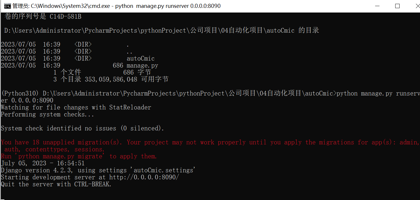 (Python310) D:\Users\Administrator\PycharmProjects\pythonProject\公司项目\04自动化项目\autoCmic>python manage.py runserver 0.0.0.0:8090 Watching for file changes with StatReloader Performing system checks... System check identified no issues (0 silenced). You have 18 unapplied migration(s). Your project may not work properly until you apply the migrations for app(s): admin, auth, contenttypes, sessions. Run 'python manage.py migrate' to apply them. July 05, 2023 - 16:54:51 Django version 4.2.3, using settings 'autoCmic.settings' Starting development server at http://0.0.0.0:8090/ Quit the server with CTRL-BREAK.