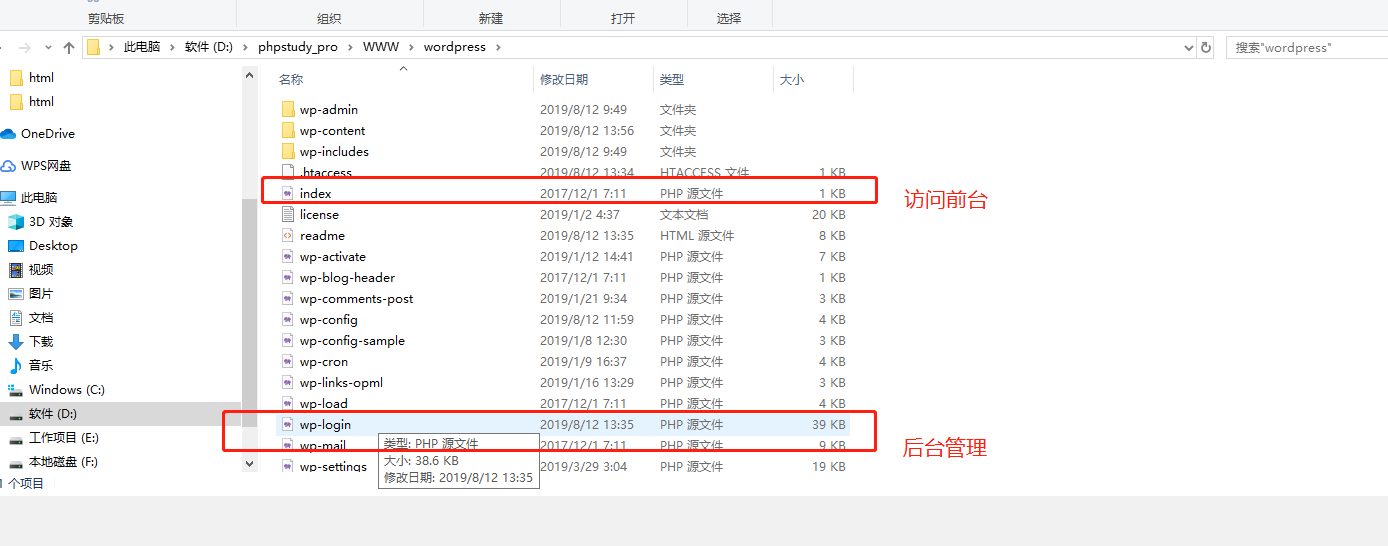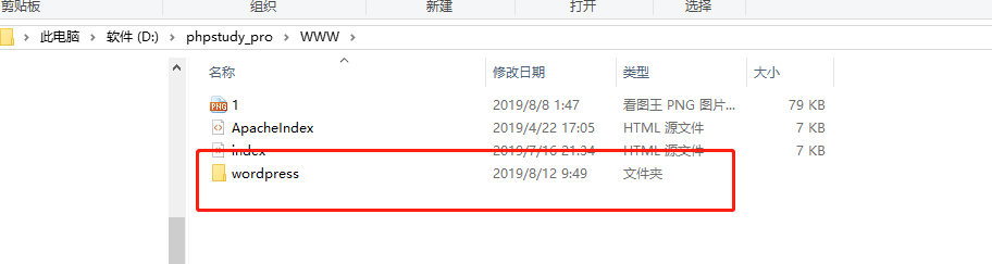 下载安装好wordpress之后,将wordpress整个文件放到,phpstudy安装目录下的www文件下。如图